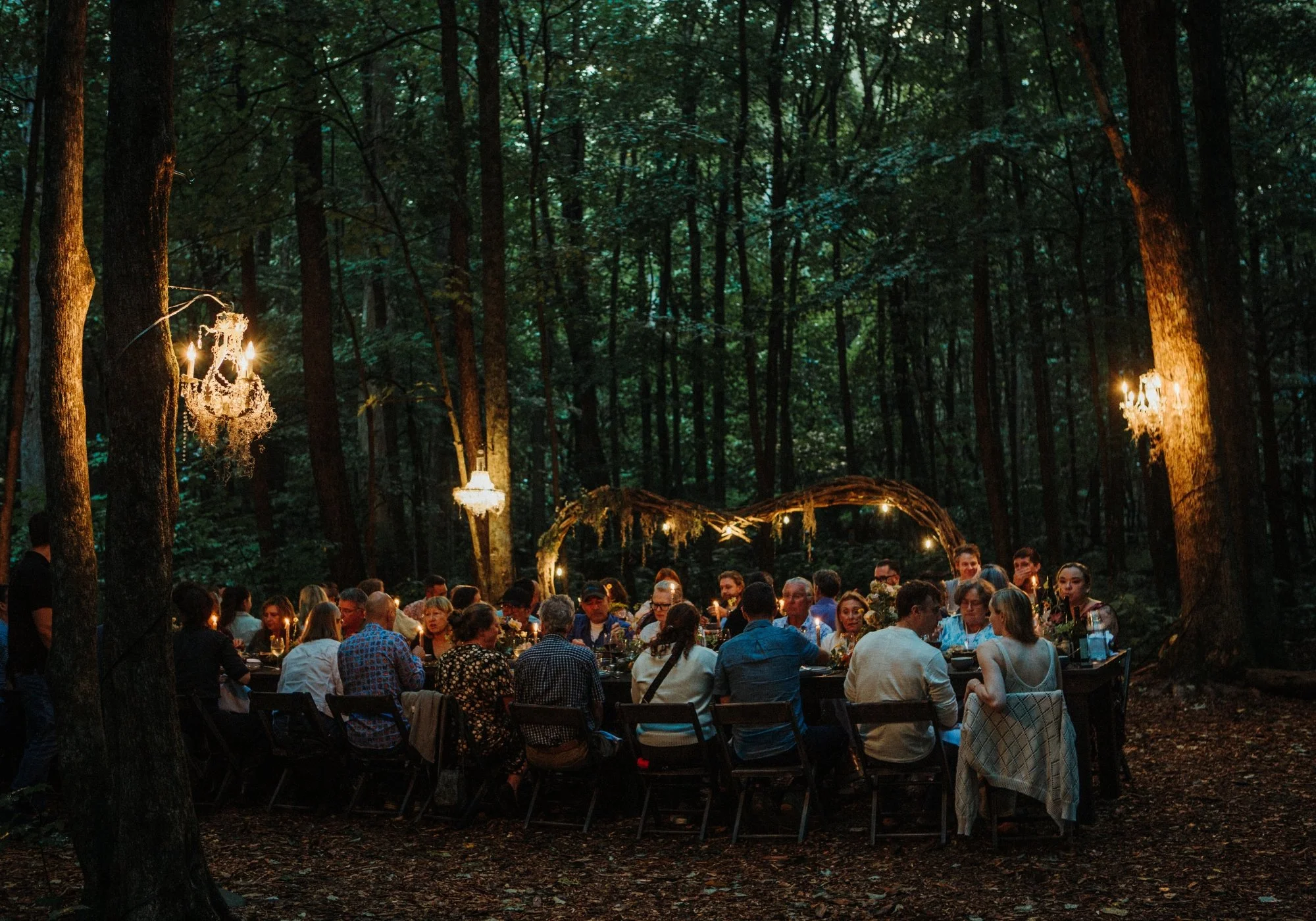 Afterward, guests are guided through the meadow and along a wooded path to long candlelit tables set deep in the forest, where a generous multi-course dinner is served family-style with complimentary beer and wine included with your ticket